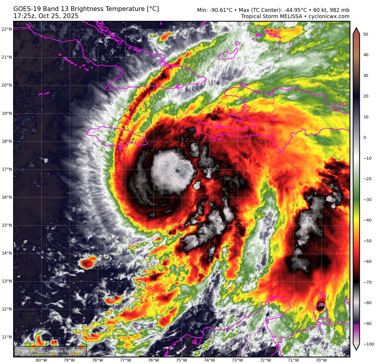 Les départements du Sud et de la Grand’Anse ont été placés en alerte rouge ce samedi 25 octobre 2025, alors que la tempête tropicale Melissa s’est intensifiée pour devenir un ouragan de catégorie 1. Les vents atteignent 200 km/h, se déplaçant lentement à 4 km/h vers Haïti, et jusqu’à 500 mm de pluie sont attendus dans certaines zones.