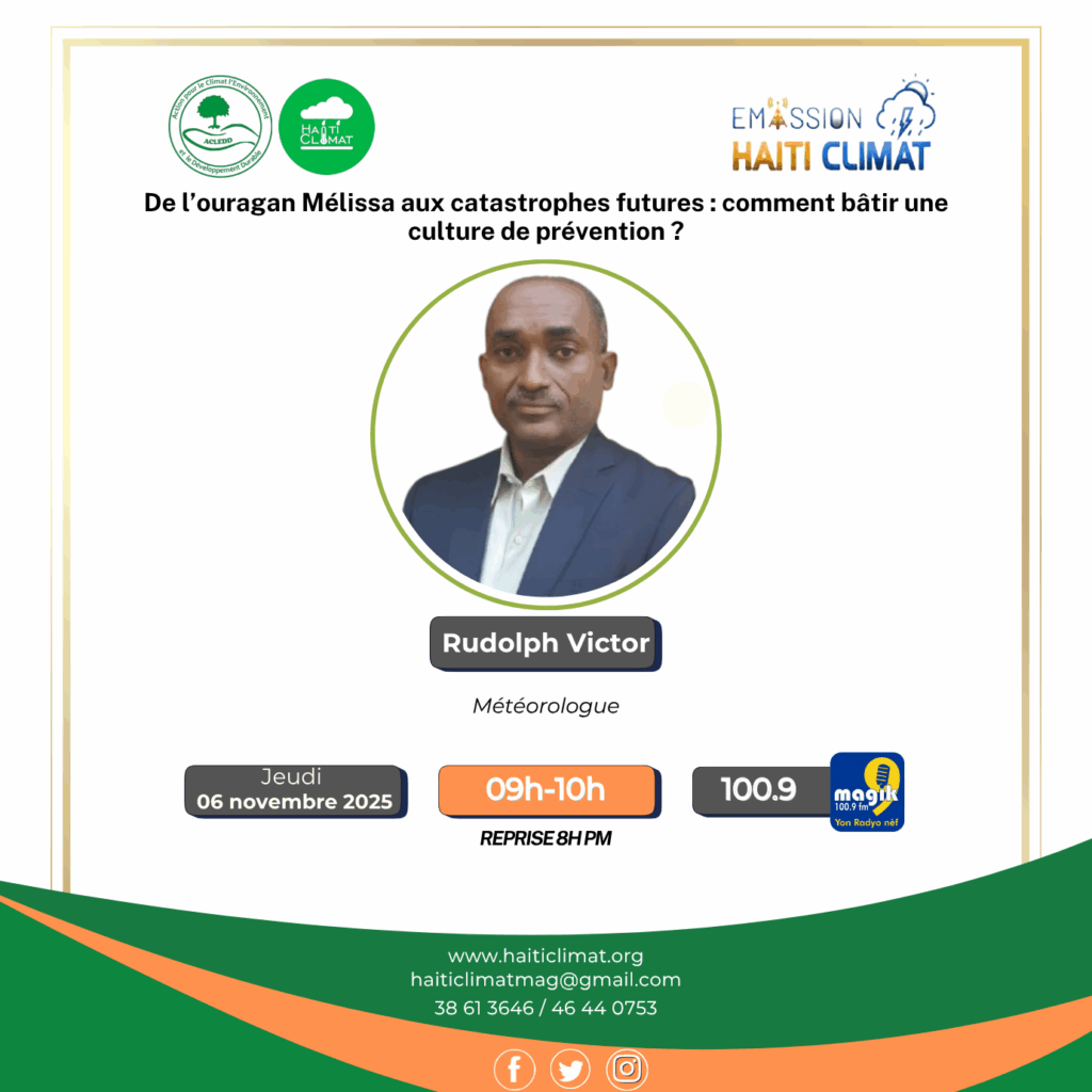 Quelques jours après le passage dévastateur de l’ouragan Mélissa, qui a durement frappé Haïti comme plusieurs pays de la région caribéenne, l’émission HaïtiClimat, diffusée le 6 novembre 2025, a reçu le météorologue Rudolph Victor autour du thème : « De l’ouragan Mélissa aux catastrophes futures : comment bâtir une culture de prévention ? »