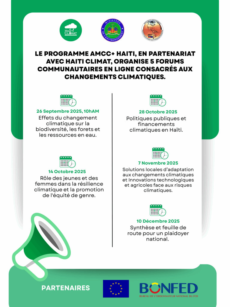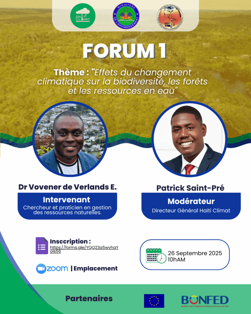 Le programme AMCC+ Haïti, en partenariat avec la plateforme multimédia Haïti Climat, a organisé, le vendredi 26 septembre 2025, la première édition d’une série de cinq forums communautaires en ligne consacrés aux changements climatiques. Cette rencontre virtuelle organisée via la plateforme de rencontre Zoom a eu pour thème : « Effets du changement climatique sur la biodiversité, les forêts et les ressources en eau ».