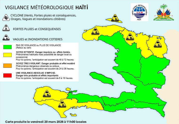 Face à ces prévisions, l’Unité hydrométéorologique (UHM), de concert avec la Direction générale de la protection civile (DGPC) et le Système national de gestion des risques et des désastres, maintient une vigilance jaune pour fortes pluies sur les départements du Nord-Ouest, du Nord, du Nord-Est, de la Grand’Anse et du Sud. Les autorités mettent en garde contre des risques modérés d’inondations soudaines, d’éboulements et de glissements de terrain dans ces zones, tout en soulignant que certains secteurs de l’Ouest et du Centre pourraient également être touchés par des averses en fin de journée.