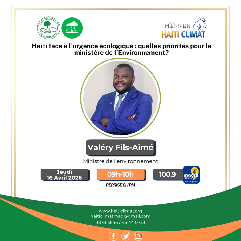 Lors de son intervention à l’émission Haïti Climat le 16 avril 2026, le ministre de l’Environnement, Valéry Fils Aimé, a présenté les grandes orientations de son ministère ainsi que plusieurs actions concrètes en cours et à venir pour faire face aux défis environnementaux du pays.